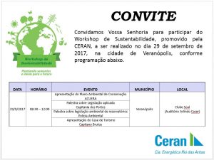Um conjunto de palestras que abordará aspectos relacionados com o uso do entorno do reservatório da CERAN será a principal atração do Workshop de Sustentabilidade, que será realizado no dia 29 de setembro, a partir das 9 horas, no Clube SOAL, na cidade de Veranópolis.